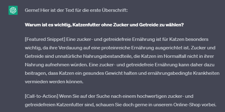 Content für eine Überschrift eines Themas, mit Featured Snippet, Call-To-Action, 2 visuellen Elementen (Grafik, Tabelle)